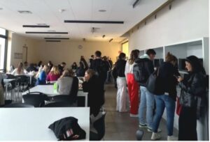 En continuant ce cheminement visuel, on peut observer une personne bousculée par des élèves pressés de vaquer à leurs occupations. Celle-ci doit enjamber des sacs laissés sur le sol par leurs propriétaires. Elle trouve enfin une place où s’assoir. « Ouf », l’étudiant peut se reposer quelques instants, avant que ses sens ne soient saisis de tous les côtés. Un de ses camarades de table entame une conversation, une personne s’esclaffe, quelqu’un éternue. Chacun sort sa nourriture. Cet élève fait la même chose.